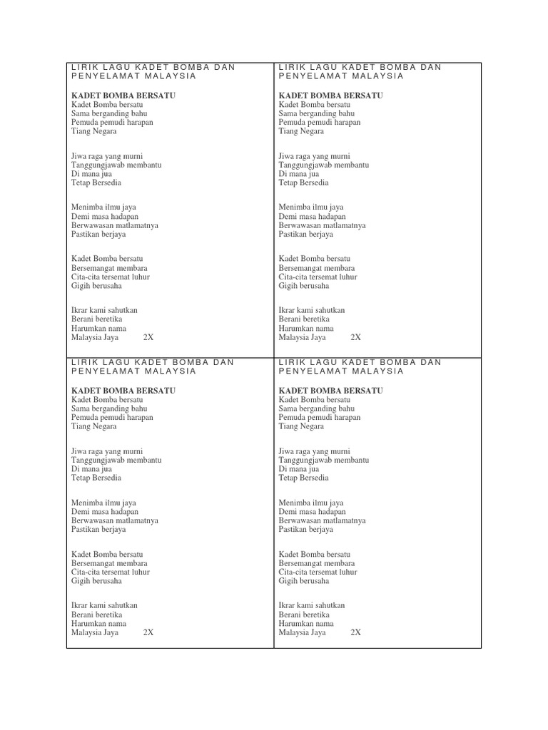 Lirik Lagu Kadet Bomba from imgv2-2-f.scribdassets.com Dasar pengurangan beban perbelanjaan awam; Lirik lagu disana menanti disini menunggu; Lirik lagu kadet bomba dan penyelamat malaysia. Lirik lagu kadet remaja sekolah (krs)kadet remaja sekolah,menuju satu ikatan bersaudara,bersatu menjulang keamanan negara,menjayakan ilmu, iman dan. Pasukan kadet bomba dan penyelamat vi. Malaysia jaya ( 2x ) disclaimer: Kadet bomba dan penyelamat smk tun haji abdul malek cheng melaka logo kadet bomba Pembekal bendera and menjual bendera negeri dalam malaysia.
